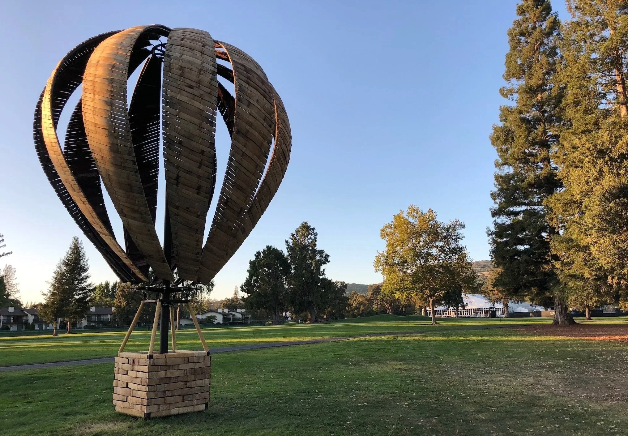 Made from aged oak barrels that once helped shape some of the world's most famous wines, B'LOON represents an inside out perspective of the iconic Napa Valley. Over 36 barrels and 1,000 staves fit together to replicate a life sized hot air balloon, which can be seen exuberantly rising from the valley floor most mornings. The piece was 22 ft. tall and weighed approximately 4,000 lbs.