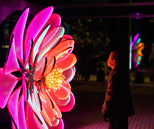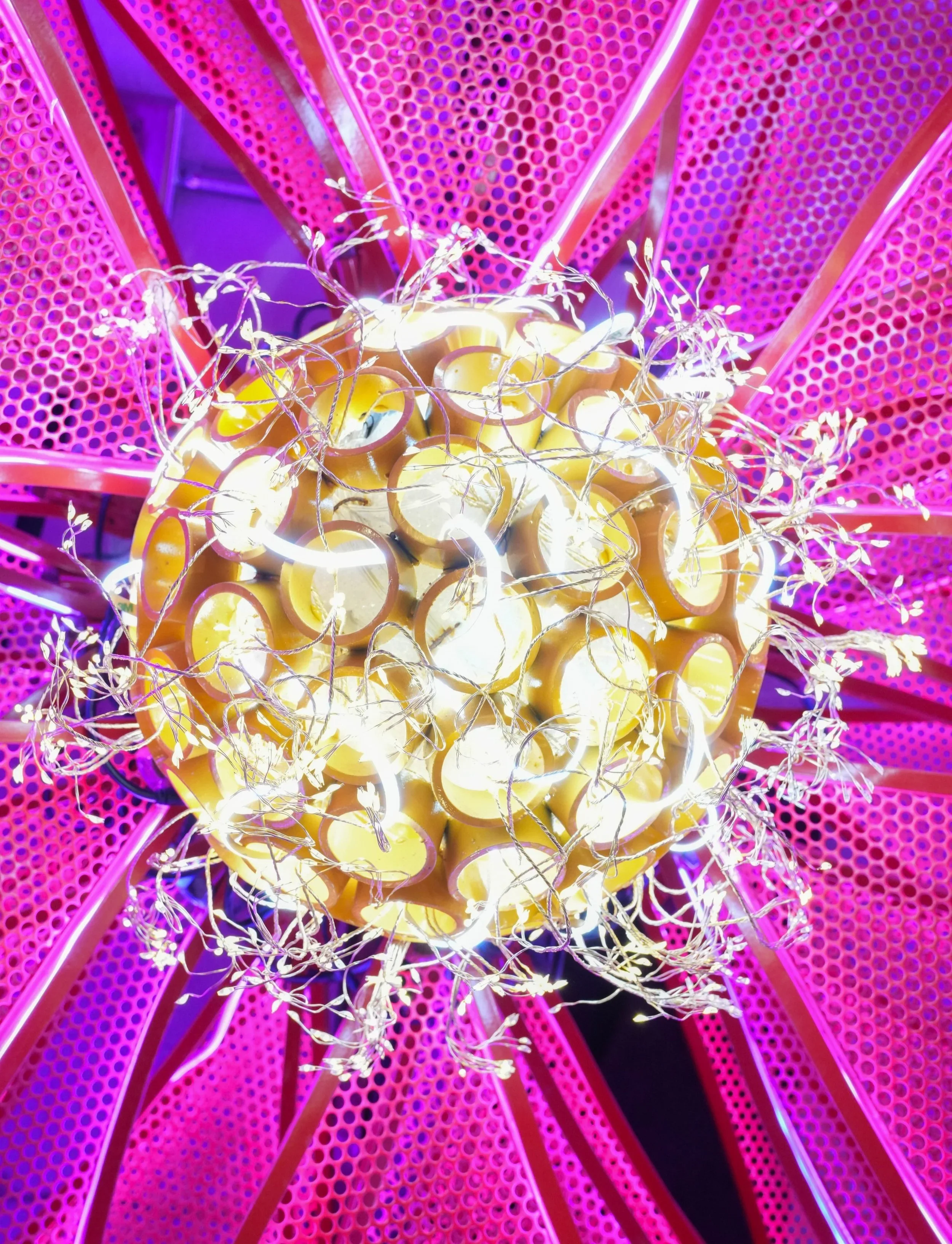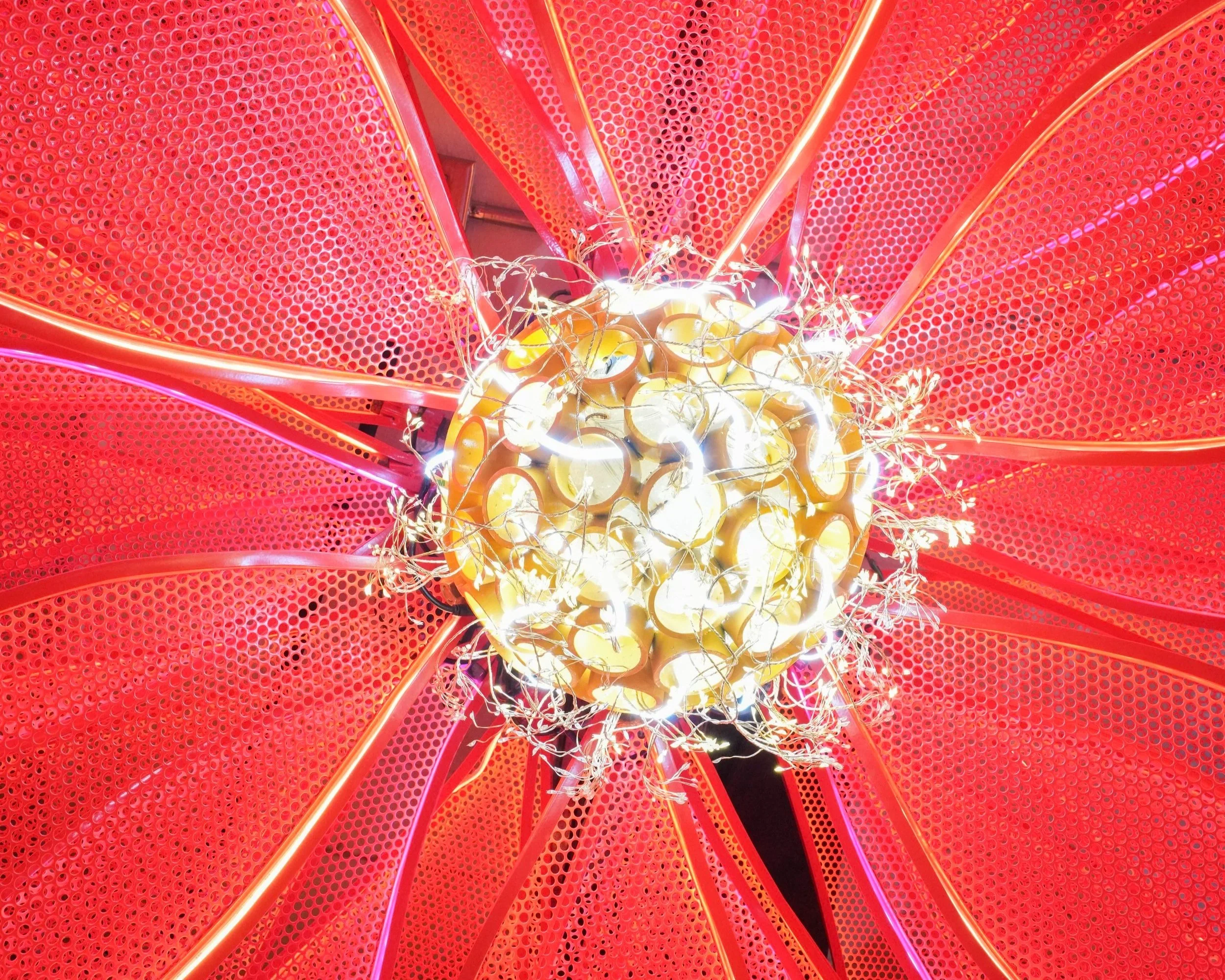 “Dahlia” is a continuation of Studio Lesec’s flower series, which re-conceptualizes organic form through the transformative quality of LED light. The petals of the flower are rendered in perforated aluminum and become translucent when struck by LED light source. The layered overlap of each petal encourages the transfer of color from foreground to background and visa-versa, dissolving figuration at times and reinforcing it at others.