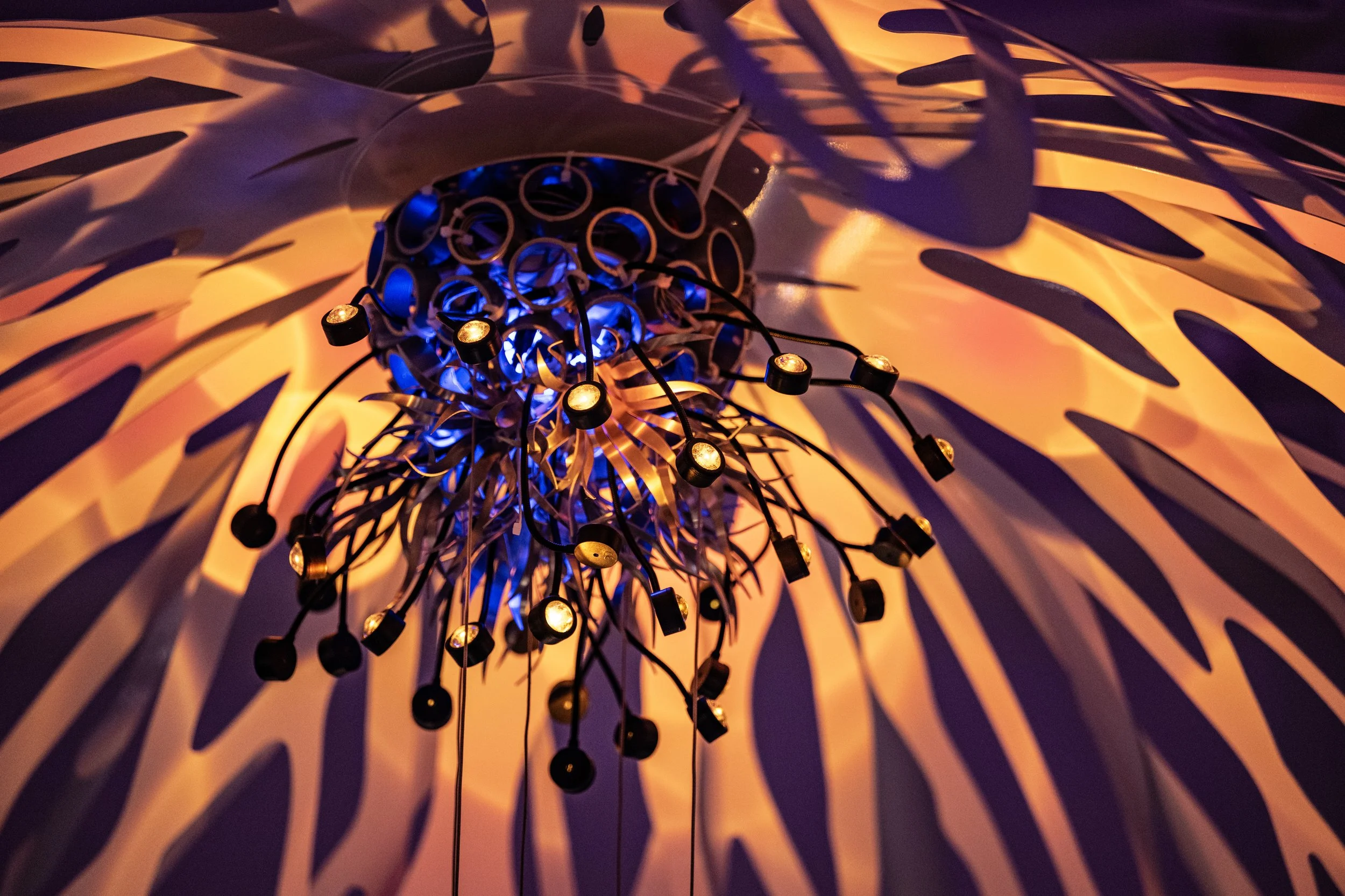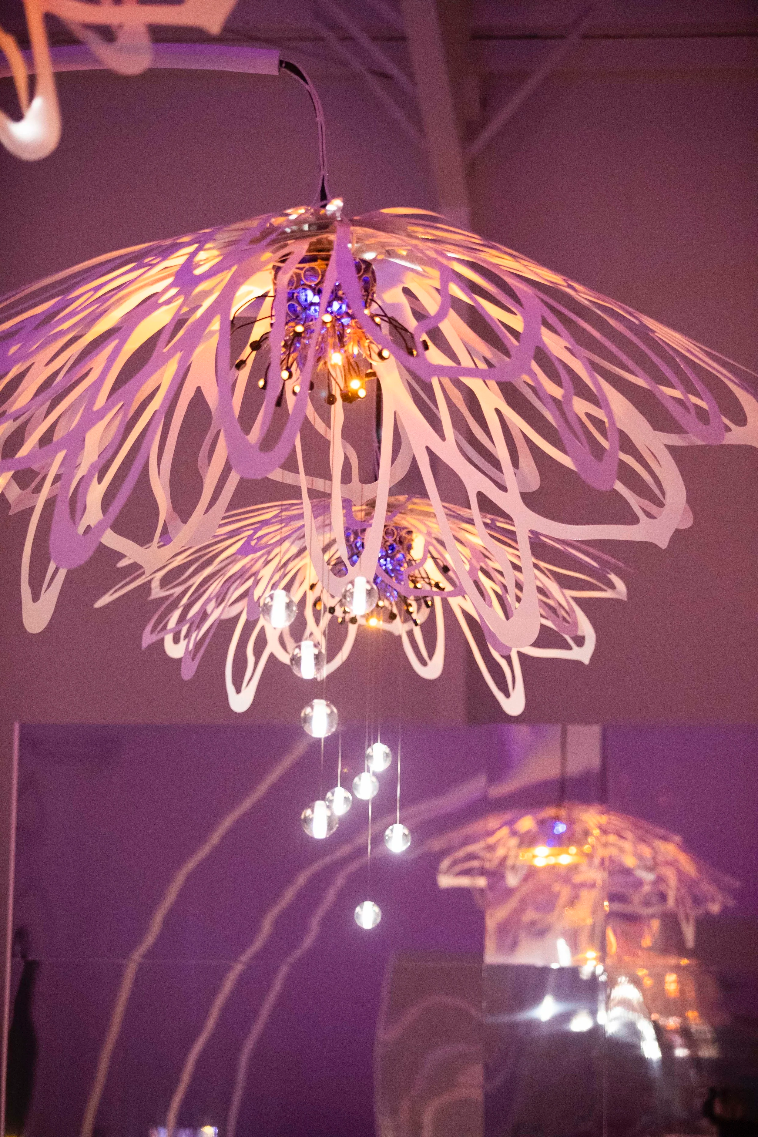 Inflorescence explores the idea of interconnection between plants, animals, and humans. A set of three organically shaped lighted chandeliers rise high above the audience, as lighted stamens cascade down the center of each flower. Inflorescence made its debut at a private dinner for the 2025 Naples Winter Wine Festival, which raises money for underprivileged children in Collier County, Florida.